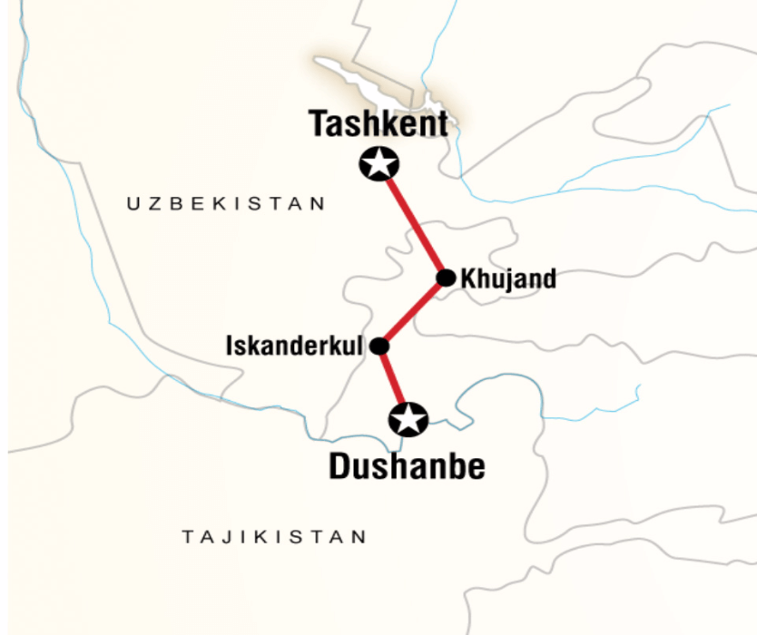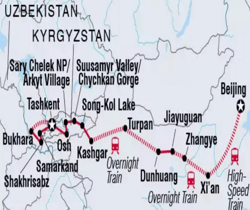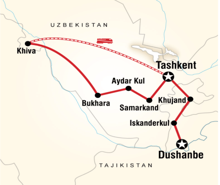 Tashkent, Samarkand, Bukhara, Khiva, Almaty, Tiyanshan Mountains, Bishkek, Issyk Kul Lake area,